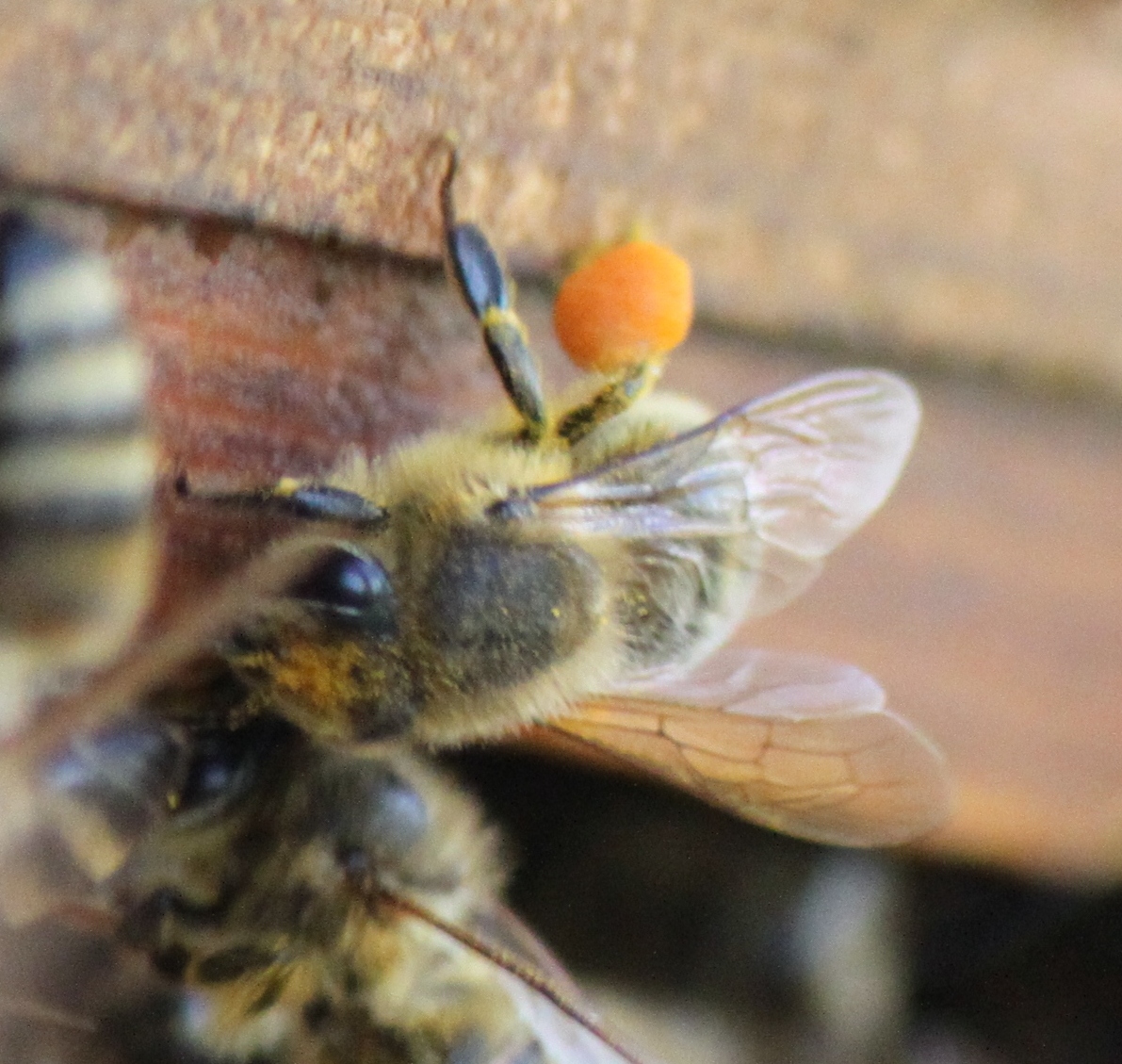 thank me, I feel certain, for this painstaking endeavor. So I push on, asking for one more smile. Dare I say they dread to see me with the camera? But the bees…they don’t mind at all!! The cool thing about bee photography is that you get clues as to what is happening inside the hive. For instance during my recent Sunday afternoon photo shoot, I saw three distinctly different colors of pollen being taken in the hive. Pollen ranged from bright orange to yellow to pale green, letting us know that the bees are foraging from at least three different types of plants.